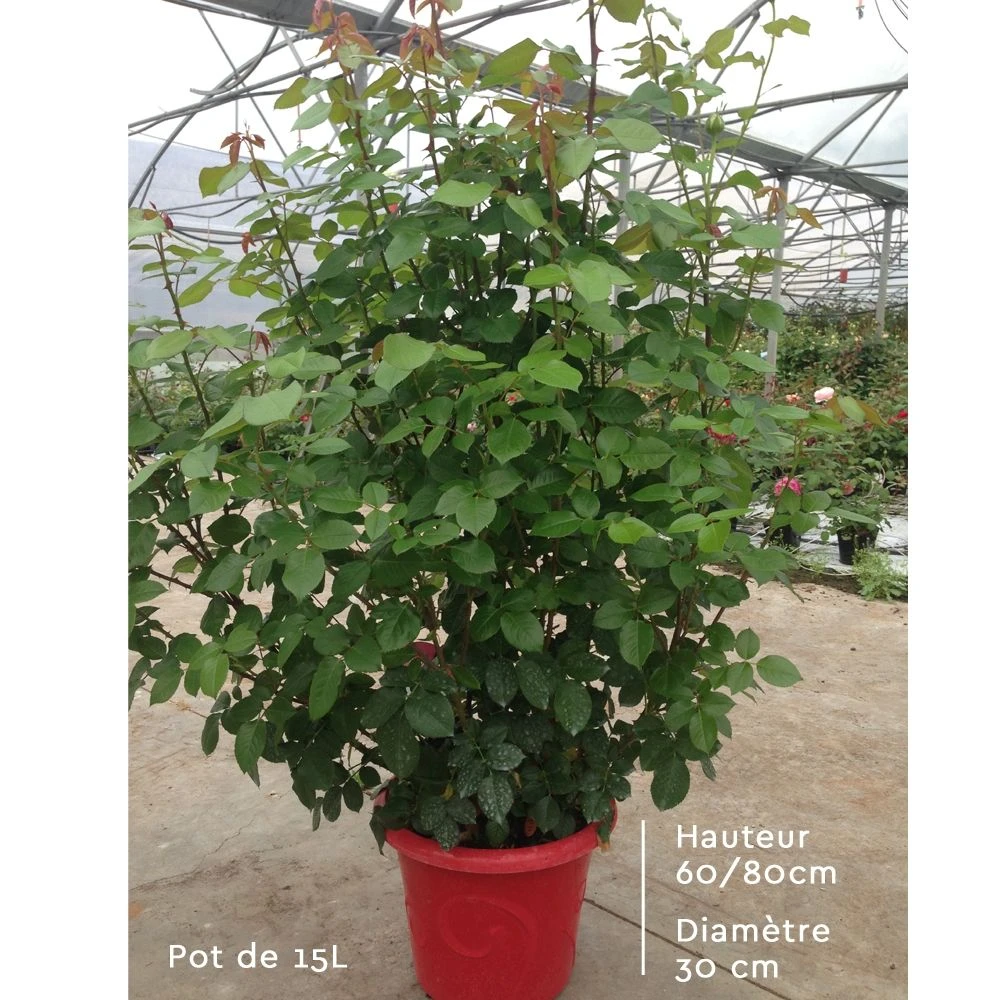 – Rosiers en pot de 2 ou 3 litres : livrés en végétation d’avril à octobre. Hauteur moyenne variable de 15 cm en sortie d’hiver à 25/35 cm au printemps. Leurs hauteurs varient en fonction de la saison et surtout des tailles que nous faisons dans nos serres (n’oubliez pas que les rosiers aiment être taillés).